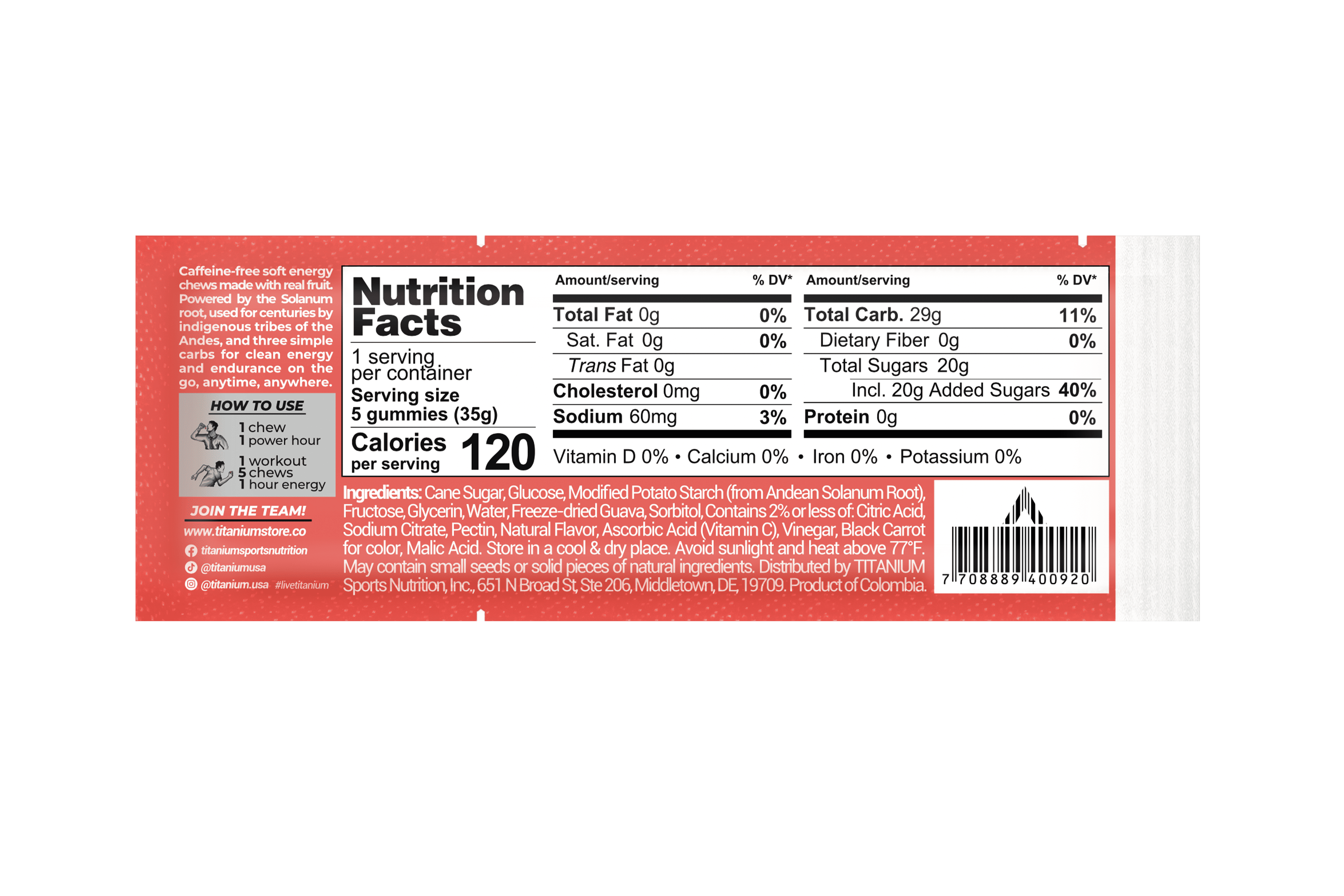 Sodium is an electrolyte lost in sweat in charge of driving water inside and outside your body cells hence contributing to keeping you properly hydrated. Each packet of TITANIUM energy chews gives you 50 milligrams of sodium that will help you enhance liquid absorption when training.