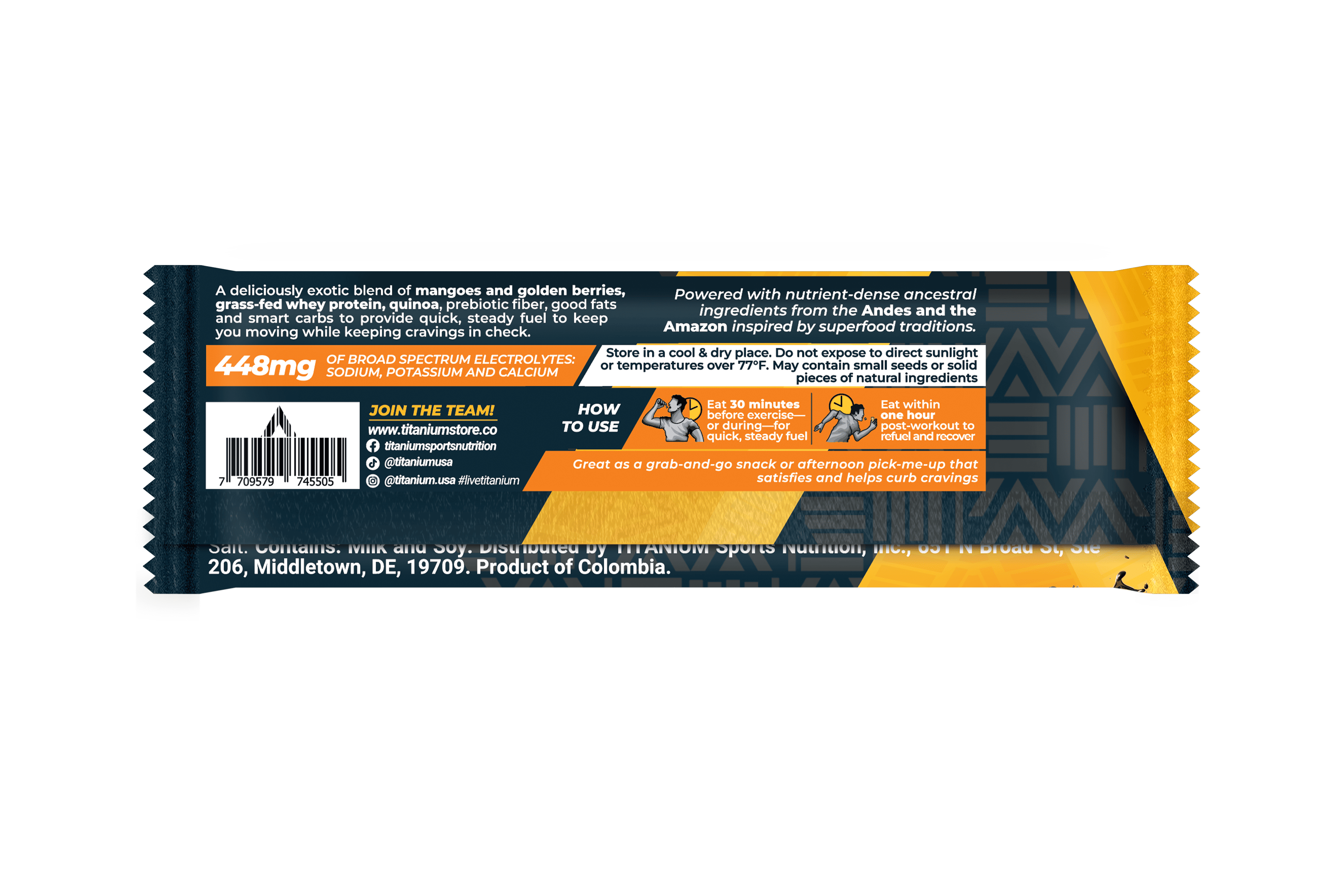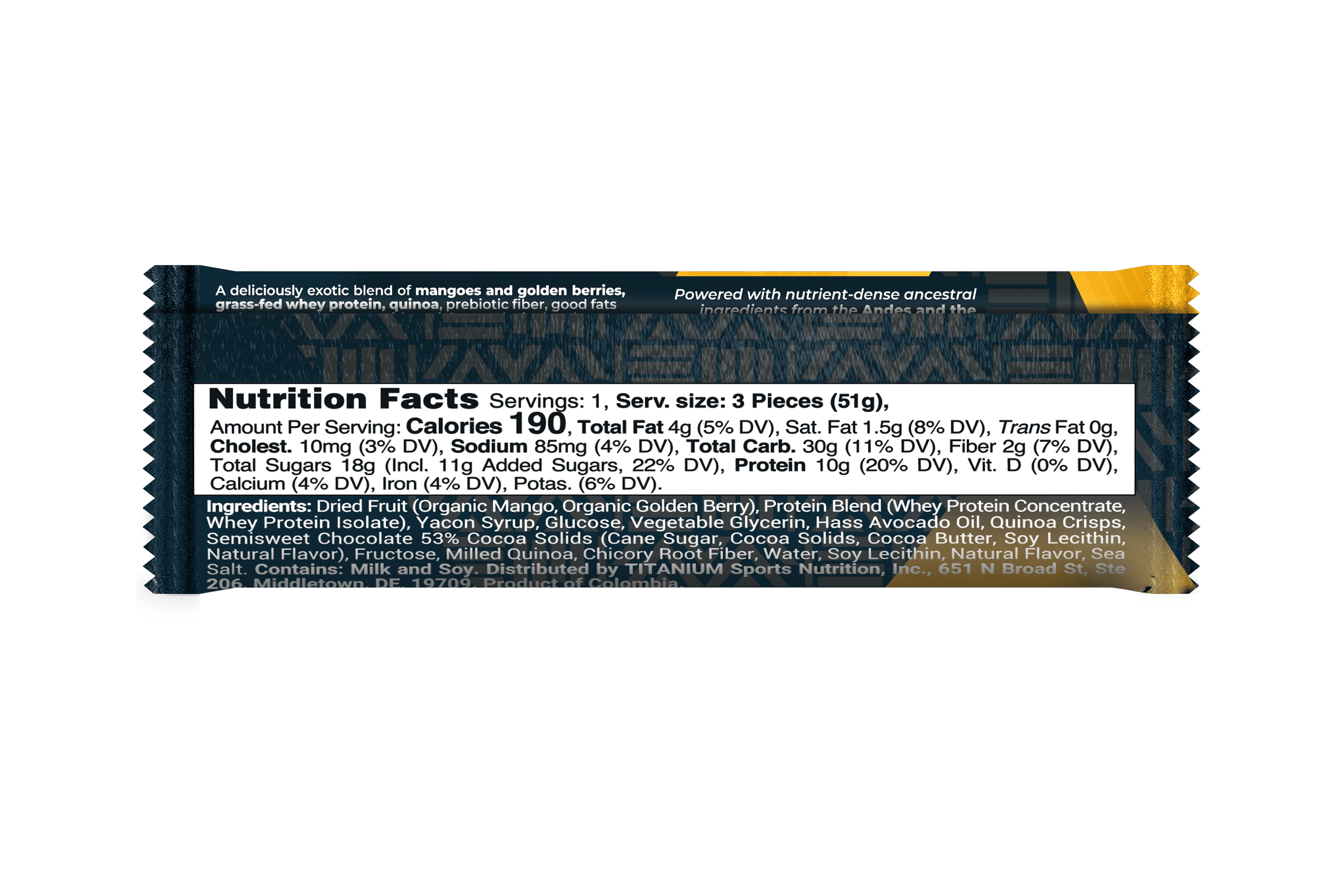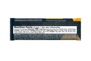 Amazonian Gold: Sweet organic mango meets tangy golden berries with rich dark chocolate chips. Made with 1/3 of mangoes and 2 1/2 golden berries per bar.